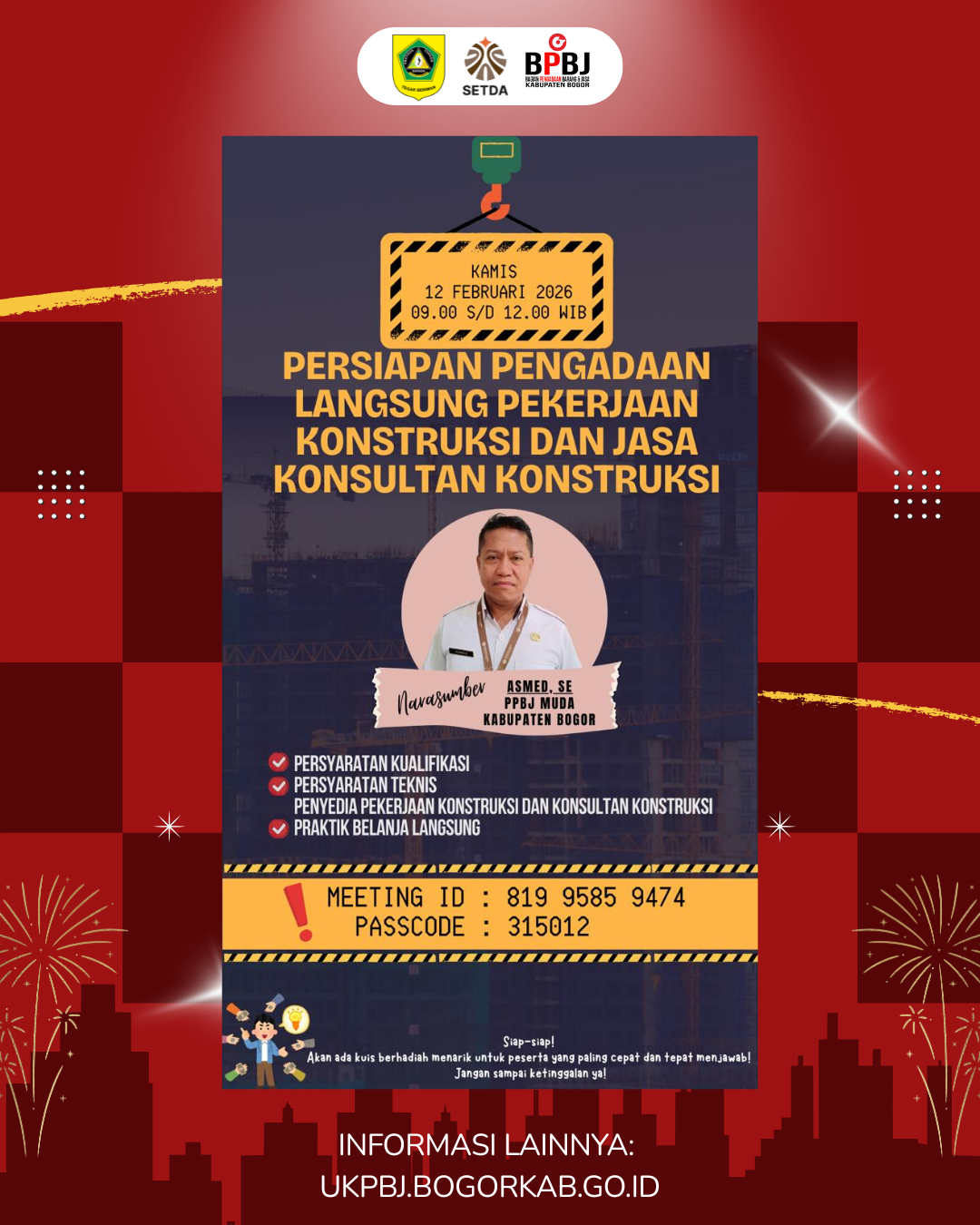 Bagian Pengadaan Barang dan Jasa (PBJ) Sekretariat Daerah Kabupaten Bogor mengadakan Seruan Pengadaan Barang/Jasa (PBJ) terkait Persiapan Pengadaan Langsung Pekerjaan Konstruksi dan Jasa Konsultan Konstruksi.